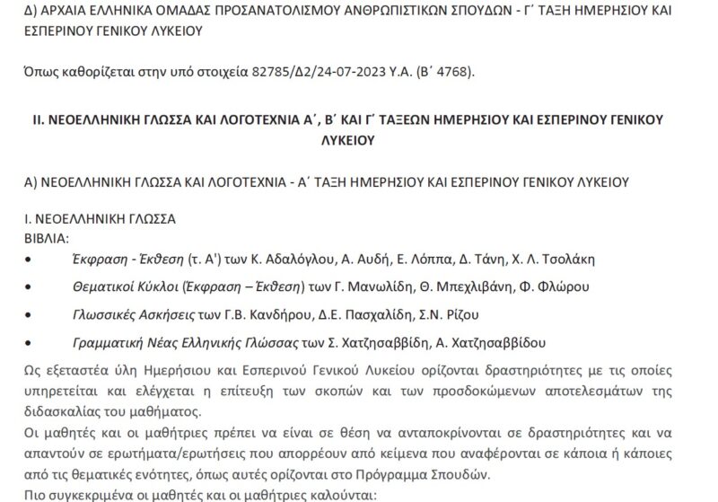 Καθορισμός εξεταστέας ύλης για τα μαθήματα των Α’, Β’ και Γ’ τάξεων Γενικού Λυκείου που εξετάζονται γραπτώς στις προαγωγικές και απολυτήριες εξετάσεις για το σχολικό έτος 2023-2024.