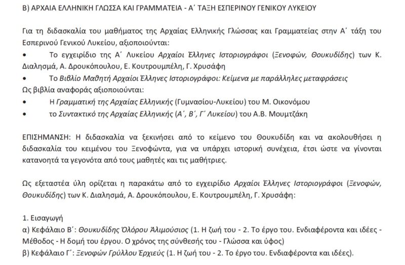 Εξεταστέα ύλη Αρχαίας Ελληνικής Γλώσσας ΓΕΛ 2023-2024 ανακοινώθηκε με την υπ’ αριθμ. 91771/Δ2 Υπουργική Απόφαση (ΦΕΚ 5162 Τεύχος Δεύτερο 22 Αυγούστου 2023) έχοντας ως θέμα: