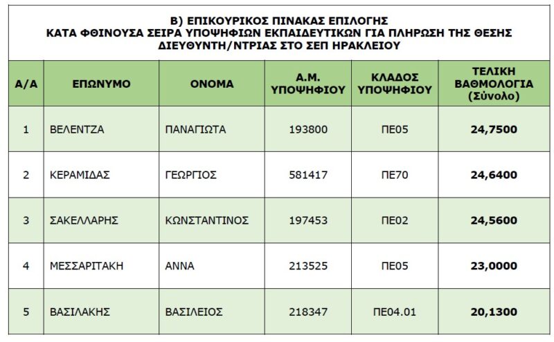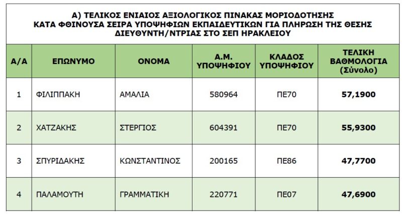 Κύρωση του τελικού ενιαίου αξιολογικού μοριοδότησης και επικουρικού πίνακα επιλογής, κατά φθίνουσα σειρά, υποψηφίων εκπαιδευτικών για πλήρωση με επιλογή θέσης Διευθυντή/ντριας του Σχολείου Ευρωπαϊκής Παιδείας Ηρακλείου Κρήτης (Σ.Ε.Π)