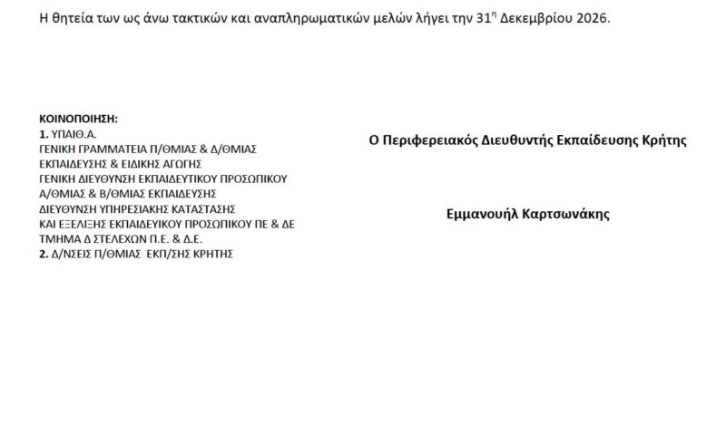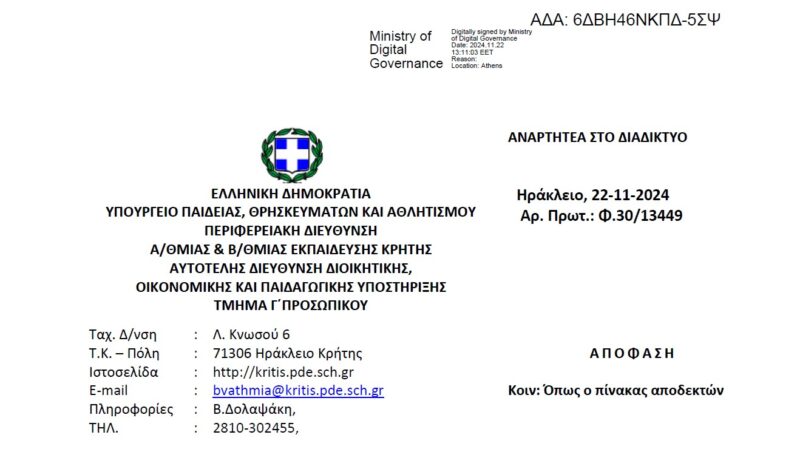 Διορισμός Αιρετών ΑΠΥΣΔΕ Κρήτης 2024 ανακοινώθηκε με το υπ’ αριθμ. Φ.30/13449/22-11-2024 έγγραφο της Περιφερειακής Διεύθυνσης Αθμιας και Βθμιας Εκπαίδευσης Κρήτης με θέμα: