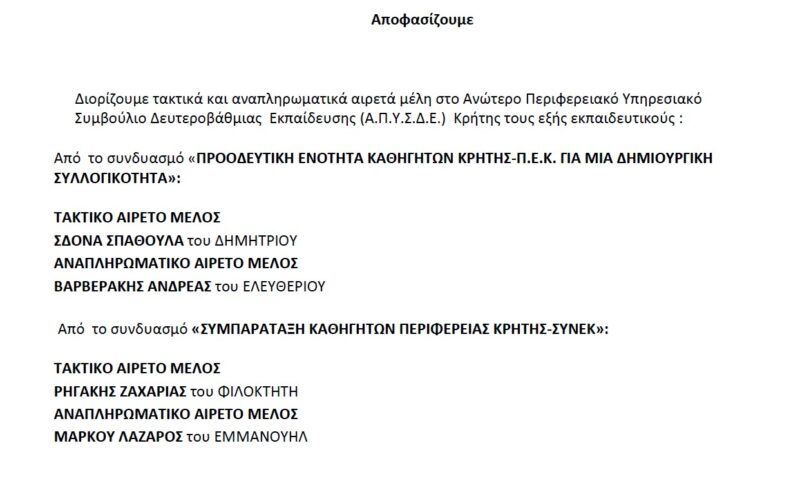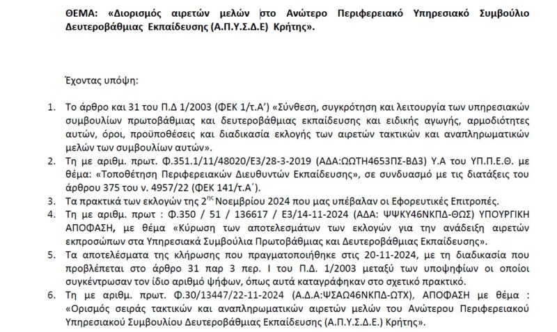 Διορισμός αιρετών μελών στο Ανώτερο Περιφερειακό Υπηρεσιακό Συμβούλιο Δευτεροβάθμιας Εκπαίδευσης (Α.Π.Υ.Σ.Δ.Ε.) Κρήτης