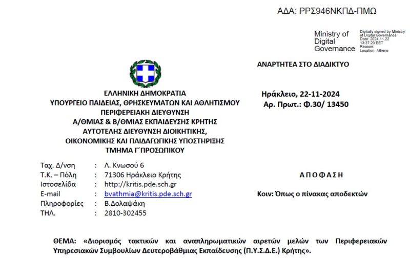 Διορισμός Αιρετών ΠΥΣΔΕ Κρήτης 2024 ανακοινώθηκε με το υπ’ αριθμ. Φ.30/13450/22-11-2024 έγγραφο της Περιφερειακής Διεύθυνσης Αθμιας και Βθμιας Εκπαίδευσης Κρήτης με θέμα: