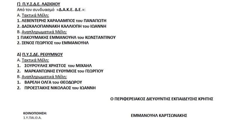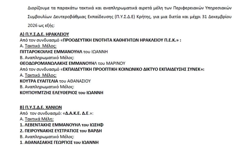 Διορισμός τακτικών και αναπληρωματικών αιρετών μελών των Περιφερειακών Υπηρεσιακών Συμβουλίων Δευτεροβάθμιας Εκπαίδευσης (Π.Υ.Σ.Δ.Ε.) Κρήτης
