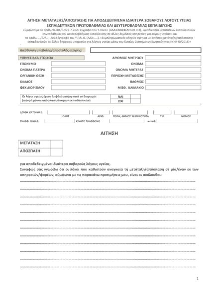 ΑΙΤΗΣΗ ΜΕΤΑΤΑΞΗΣ/ΑΠΟΣΠΑΣΗΣ ΓΙΑ ΑΠΟΔΕΔΕΙΓΜΕΝΑ ΙΔΙΑΙΤΕΡΑ ΣΟΒΑΡΟΥΣ ΛΟΓΟΥΣ ΥΓΕΙΑΣ ΕΚΠΑΙΔΕΥΤΙΚΩΝ ΠΡΩΤΟΒΑΘΜΙΑΣ ΚΑΙ ΔΕΥΤΕΡΟΒΑΘΜΙΑΣ ΕΚΠΑΙΔΕΥΣΗΣ